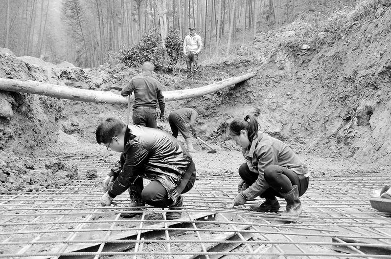 受水源地缺水的影響,永安煤業(yè)公司池坪蘆坑煤礦職工澡堂用水比較緊張。近期,該礦在井口后山建設(shè)一個(gè)工業(yè)應(yīng)急蓄水池,以解決職工用水問(wèn)題。圖為3月23日,該礦工作人員在施工工業(yè)應(yīng)急蓄水池。