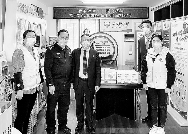 4月2日上午,福州美倫大飯店副總經(jīng)理李炳后(中)等一行3人到福州永恒社區(qū),向社區(qū)捐贈(zèng)測(cè)溫槍、擴(kuò)音喇叭等防疫物資,助力社區(qū)疫情防控。(美倫 攝影報(bào)道)