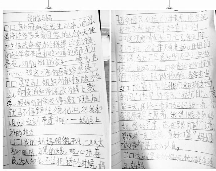 到了晚上,劉巧玲還要輔導孩子上網(wǎng)課。她的兒子在作文《我的媽媽》里記錄著媽媽的工作生活,看到兒子的作文時,她說:孩子爸爸兩年前因病去世了,是黨給了我溫暖和關(guān)懷,讓我挺了過來,燃起了生活的希望,是黨培養(yǎng)了我,抗疫這點苦和累不算什么。