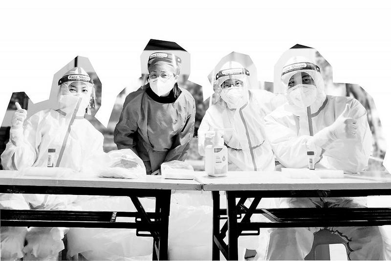 圖為吳春花(左二)在核酸檢測(cè)現(xiàn)場(chǎng)與醫(yī)護(hù)人員合影留念 “請(qǐng)準(zhǔn)備好采樣登記二維碼或身份證,請(qǐng)帶好口罩,保持一米距離。在石獅某小區(qū),臨時(shí)樓棟長吳春花來回穿梭在核酸檢測(cè)隊(duì)伍中不斷提醒,忙碌地維持現(xiàn)場(chǎng)秩序。