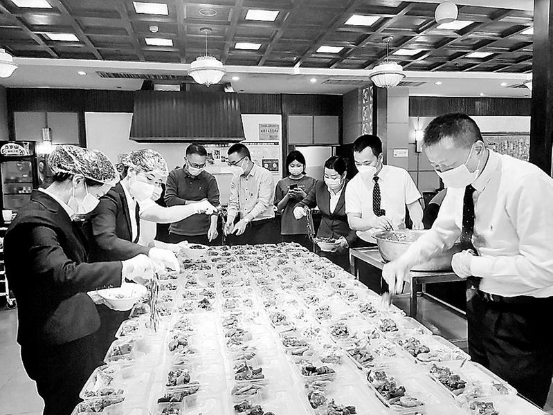 ,全力做好援寧醫(yī)療隊(duì)接待工作。。圖為飯店餐飲部和后勤部員工正在打包飯菜。(吳雅鳳攝影報(bào)道)