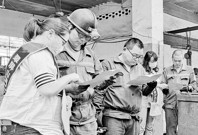 4月26日,福建煤電公司翠屏山煤礦女工委圍繞第20個(gè)《職業(yè)病防治法》宣傳周主題—“一切為了勞動(dòng)者健康”開(kāi)展宣傳活動(dòng)。圖為該礦女工深入車(chē)間發(fā)放宣傳材料。(溫曉蘭 攝影報(bào)道)