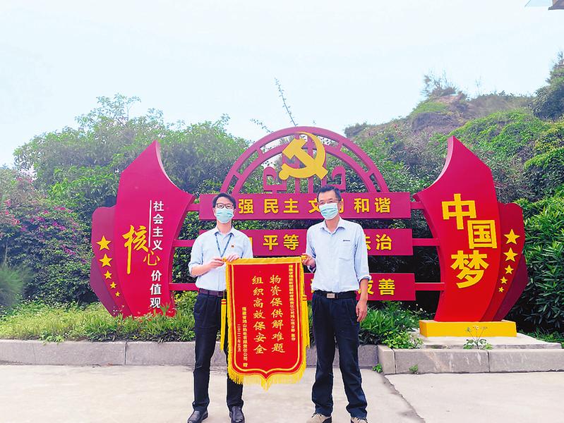5月11日,新材公司鴻山項目部獲鴻山熱電公司贈予的錦旗,對該項目部在泉州突發(fā)疫情期間全力保障鴻山電廠石粉供應(yīng),積極協(xié)調(diào)物流轉(zhuǎn)運(yùn)降低灰位,確保電廠安全生產(chǎn)表示感謝。圖為贈送錦旗現(xiàn)場。(黃顯樞 何夢薇 攝影報道)
