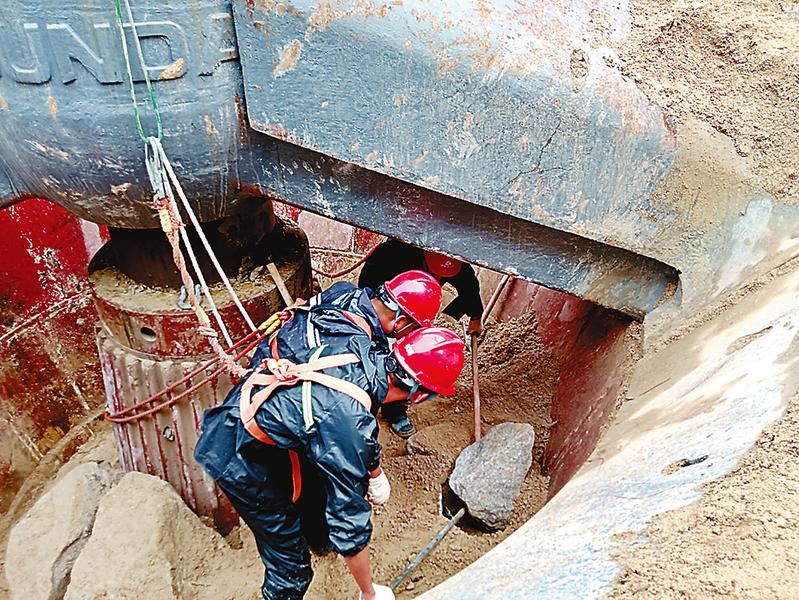 圖為搶修人員正在清理礦石和砂土 5月13日中午12點(diǎn)左右,天空正下著雨,漳州福能新材公司竹坑尾礦區(qū)101圓錐破碎機(jī)突然停止工作,中控室發(fā)出了警報(bào),圓錐破碎機(jī)出現(xiàn)了“悶機(jī)”。