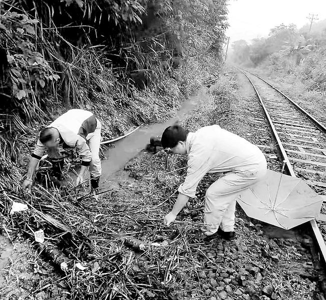 福維公司加強(qiáng)雨季巡查,組織相關(guān)部門人員深入所轄區(qū)域進(jìn)行詳細(xì)的隱患排查,確保公司設(shè)備、設(shè)施安全穩(wěn)定運(yùn)行。圖為近日,該公司生產(chǎn)保障服務(wù)中心人員正在處理堵塞的火車專用線排水溝。(張恢同攝)