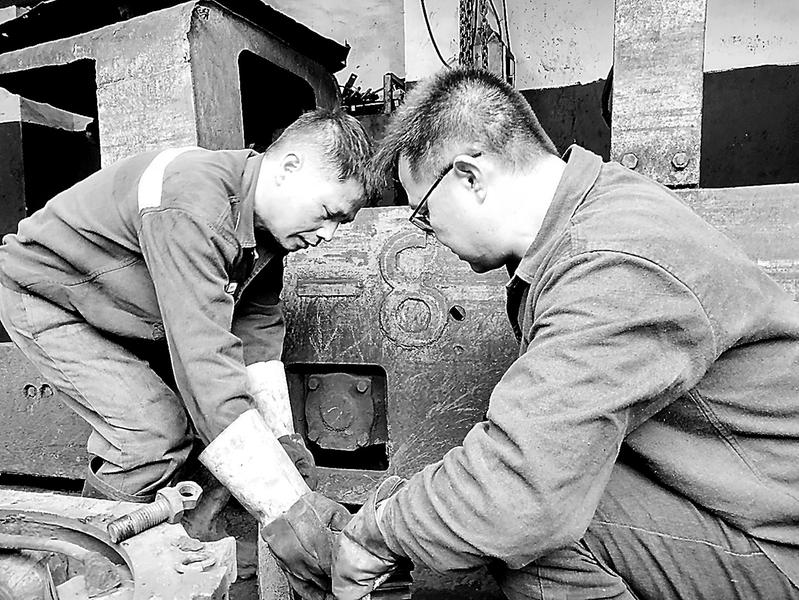 端午節(jié)假期,福建煤電公司翠屏山煤礦機(jī)修班“黨員先鋒隊(duì)”成員堅(jiān)守崗位,組織隊(duì)伍成員輪流對生產(chǎn)設(shè)備進(jìn)行檢修,消除設(shè)備隱患,提升設(shè)備完好率,助力礦井節(jié)后安全生產(chǎn)。圖為該礦機(jī)修工人正在檢修電機(jī)車齒輪。(溫曉蘭 胡永東 攝)