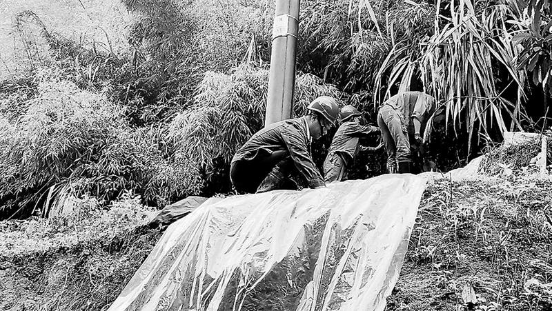 面對強降雨天氣,福建煤電電力安裝檢修公司全力做好供電線路特巡,做好搶修搶險準備工作。圖為6月7日,該公司線路特巡人員正在對電桿基礎進行加固和護坡防水處理。(張建文郭曉群攝影報道)