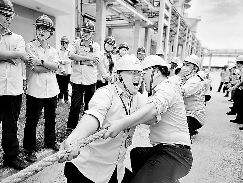 6月1日,晉南熱電公司舉行“安全生產(chǎn)月”開幕啟動儀式,全體員工在“安全生產(chǎn)月”主題橫幅上簽字,并開展了“安康杯”拔河比賽和反恐防暴應(yīng)急演練。圖為拔河比賽現(xiàn)場。