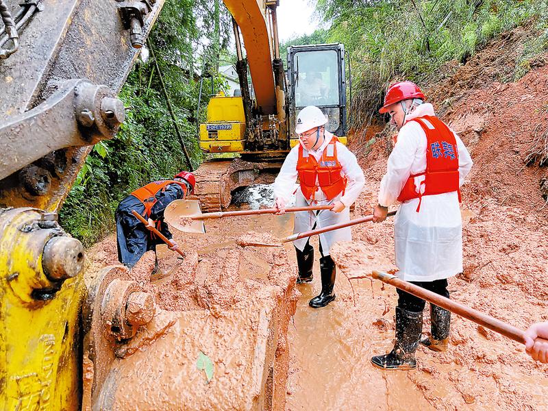 圖為6月14日下午,聯(lián)美公司駐連城分公司調(diào)派14名搶險人員,帶著挖機(jī)等3臺重機(jī)械設(shè)備,前往事發(fā)地開展清理工作。