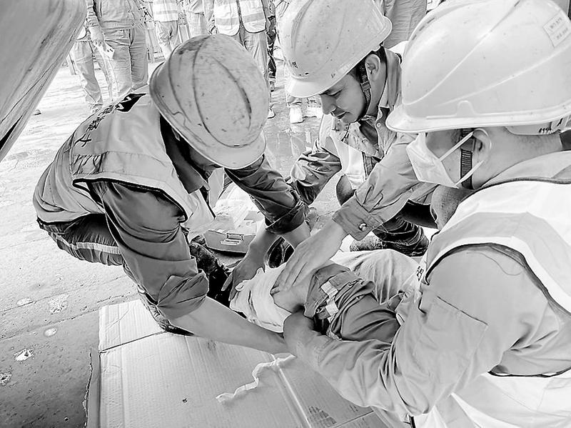 6月8日,建材控股龍巖混凝土公司開展車輛傷害事故應(yīng)急救援演練。圖為演練小組對“傷員”受傷部位進行上藥包扎。攝影報道)