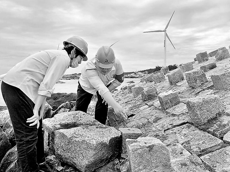針對(duì)近期泉州地區(qū)持續(xù)降雨,晉江氣電公司所屬晉江風(fēng)電場(chǎng)全力做好安全防范工作,組織人員排查風(fēng)機(jī)防浪堤壩事故隱患。圖為近日,工作人員正在排查風(fēng)機(jī)防浪堤壩。(王聰穎攝)