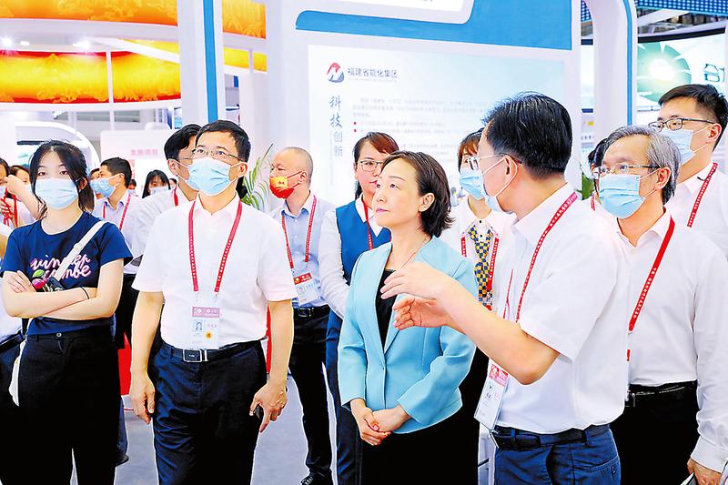 展會(huì)期間,福建省委常委、常務(wù)副省長(zhǎng)郭寧寧(中)一行巡館至能化集團(tuán)展位,了解集團(tuán)在新型清潔能源開(kāi)發(fā)利用、福建石化產(chǎn)業(yè)“兩基地一專區(qū)”建設(shè)等方面的情況。圖為集團(tuán)副總經(jīng)理朱玉武(右一)向郭寧寧介紹集團(tuán)相關(guān)情況。(安迪 悅心 攝影報(bào)道)