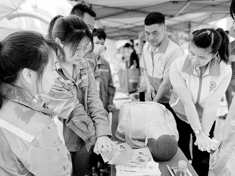 6月16日,建材控股漳州混凝土公司組織職工參加漳州市龍文區(qū)安委會舉辦的“安全生產(chǎn)月”宣傳咨詢?nèi)栈顒印D為該公司職工在學(xué)習(xí)心肺復(fù)蘇、湯姆立克法等急救技能。(韓輝 攝影報道)