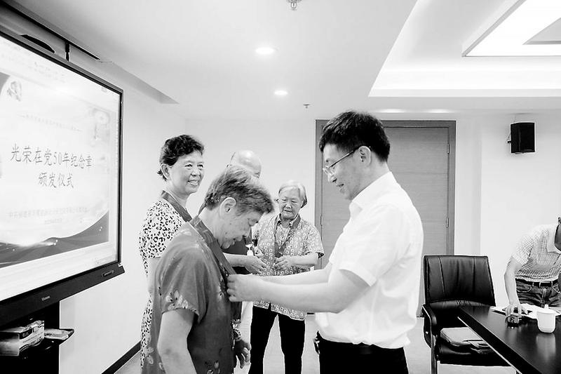6月21日,華廈設(shè)計院舉辦“光榮在黨50年”紀(jì)念章頒發(fā)儀式。圖為華廈設(shè)計院黨委副書記、總經(jīng)理施忠雄為老黨員佩戴紀(jì)念章。