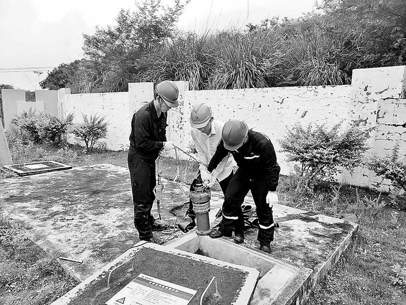 6月20日,福能新能源公司隆教風電場定期對強降雨造成的升壓站變壓器事故油池積水進行抽排。圖為工作人員使用抽水泵進行抽排水。(陳吉臻 攝)