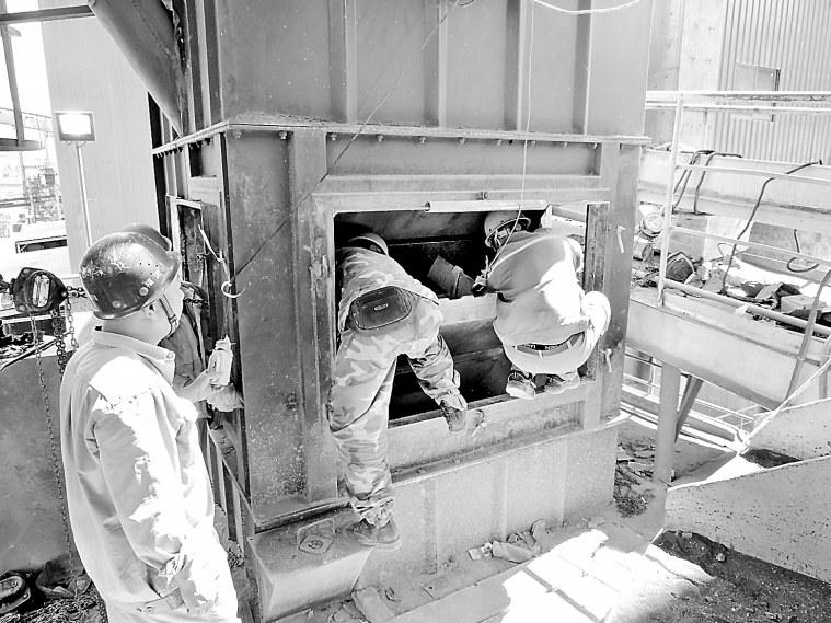 時(shí)至中午,在料斗吊裝平臺(tái),為了節(jié)省時(shí)間,一部分參戰(zhàn)人員躲在收塵管道下的陰涼處吃飯,其他人正頂著炎炎烈日搬運(yùn)料斗。陳孟鑒說:“天氣太熱,料斗被太陽曬得滾燙,盡管如此,我們還是要抓緊時(shí)間,錯(cuò)開吃飯時(shí)間,不然很難完成任務(wù)。”