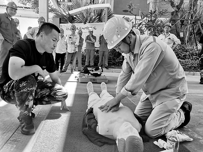 7月21日,晉南熱電公司安監(jiān)環(huán)保部牽頭組織各部門和外委單位的49名應(yīng)急救援隊(duì)員,開展季度應(yīng)急救援技能培訓(xùn)演練。圖為心肺復(fù)蘇規(guī)范化演練現(xiàn)場。(周國利攝)