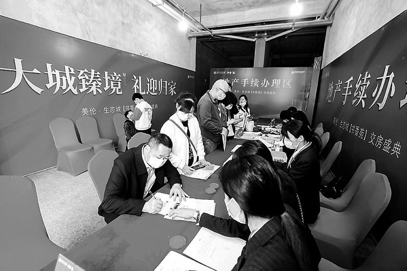 7月25日,龍巖美倫·生態(tài)城【書(shū)香苑】組團(tuán)B12-B17#樓共計(jì)753套住宅喜迎盛大交房,較原定交房合同提前67天,同時(shí)兌現(xiàn)“交房即交證”的承諾。圖為交房手續(xù)辦理現(xiàn)場(chǎng)。(鄭招華 攝)