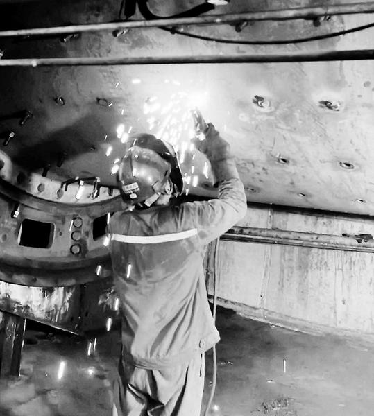 連日來(lái),高溫天氣持續(xù)打卡,但似火的驕陽(yáng)并沒(méi)有擋住福能貴電公司工作者們的工作熱情。圖為近日,檢修人員正在對(duì)制粉系統(tǒng)大罐底部進(jìn)行焊接。(費(fèi)學(xué)華 攝)