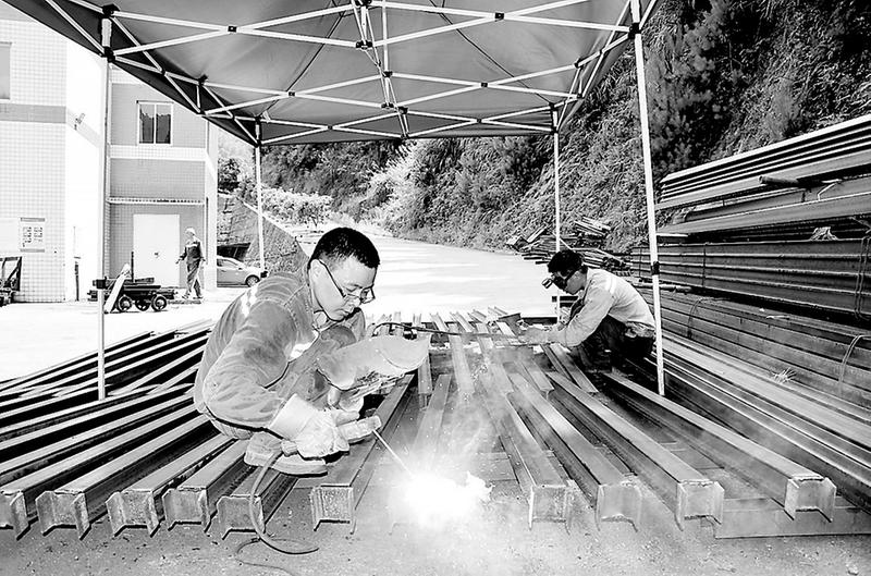 為了給一線職工提供優(yōu)質(zhì)的后勤保障,7月28日,永安煤業(yè)公司池坪蘆坑煤礦機(jī)運(yùn)隊(duì)職工冒著酷暑加工井下巷道支護(hù)使用的礦工鋼棚。(陳思洲攝)