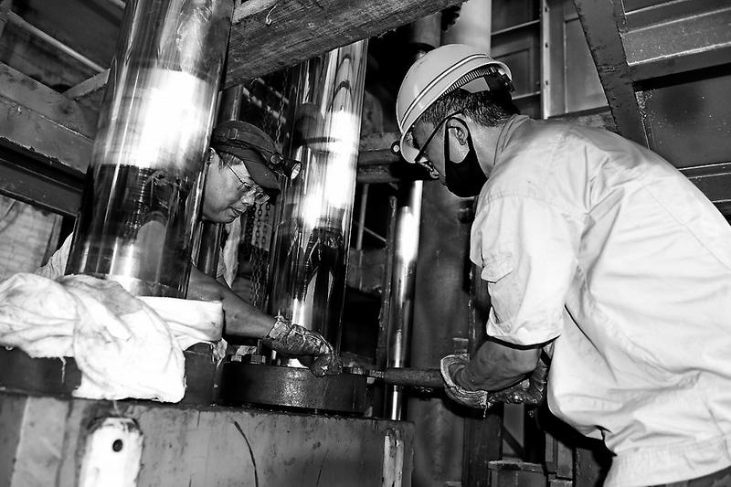 針對持續高溫對生產運行帶來的不利影響,福維公司員工在做好個人防護的同時,用汗水和堅守迎接“烤”驗,確保生產和檢修任務的完成。圖為8月10日,該公司維綸廠員工正在現場檢修設備。(陳福華攝)