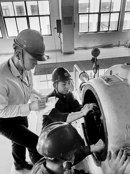 時(shí)間緊、任務(wù)重,汽機(jī)專業(yè)經(jīng)過精心組織、周密部署,合理安排檢修人員。隨著缸溫降至150℃,#3、#4瓦檢修工作的號角正式吹響。行車將汽輪機(jī)瓦蓋緩緩吊起,檢修人員嚴(yán)格按照檢修文件包步驟、標(biāo)準(zhǔn)及工藝要求,分工協(xié)作,緊盯作業(yè)現(xiàn)場,吊出軸承上蓋、測量瓦蓋緊力、軸瓦固定螺栓的檢查、瓦頂、瓦口間隙測量……高溫天氣加上汽機(jī)房內(nèi)特有的悶熱,即便架上了通風(fēng)風(fēng)機(jī),近40℃的環(huán)境仍令檢修人員仿佛置身于烤爐一般,身上的工作服和手套在被汗水浸濕和被高溫“烤”干之間反復(fù)切換。深夜,#1機(jī)組區(qū)域依舊燈火通明,行車緩緩運(yùn)行,大錘揮舞著與敲擊扳手親密接觸,汽機(jī)點(diǎn)檢工程師拿著手電對著軸瓦檢查、測量出來的數(shù)據(jù)與標(biāo)準(zhǔn)值比對。為了保證在短時(shí)間內(nèi)保質(zhì)保量完成#1汽機(jī)#3、#4軸承翻瓦檢修工作,檢修人員依舊堅(jiān)守在崗位上,一項(xiàng)項(xiàng)工作有條不紊地進(jìn)行著……