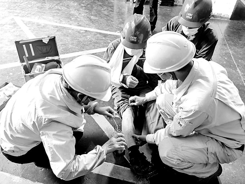 近日,福能貴電公司開展高處墜落演練。本次演練檢驗了福能貴電應急小組的施救技術及應急救援能力,增強了員工安全意識,用實際行動維護福能貴電安全生產。圖為演練現場。(秦祥 攝)
