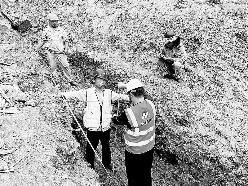 10月18日下午,福能新材公司華安機制砂項目建設單位會同參建單位開展礦區外部運礦道路盲溝驗收工作,消除道路基礎工程地下泉眼、過山溝區域安全隱患。圖為華安公司礦長吳昌水(中)現場驗收盲溝深度、寬度標準。(袁道霞攝)