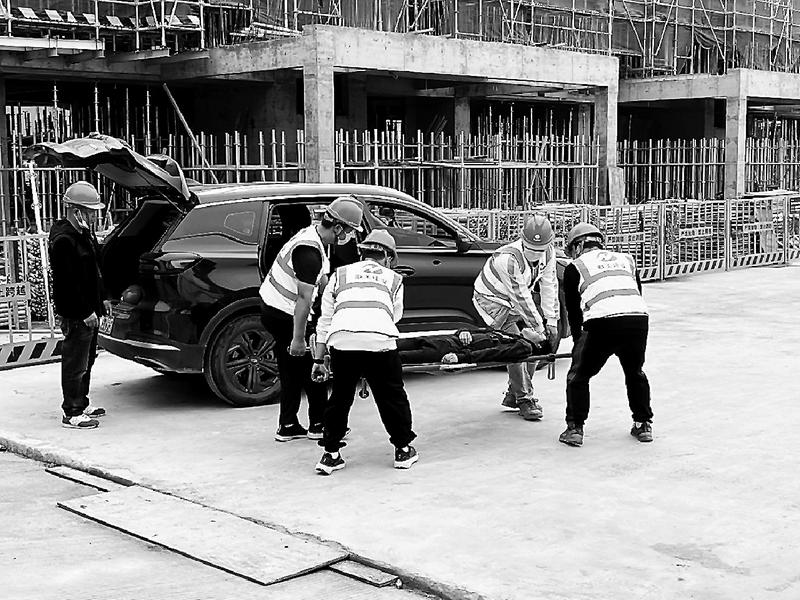 11月3日,聯美公司連城美倫山水翰林苑一期項目舉辦施工現場觸電事故應急救援演練。圖為急救演練現場。(田震 潘方斌 攝)