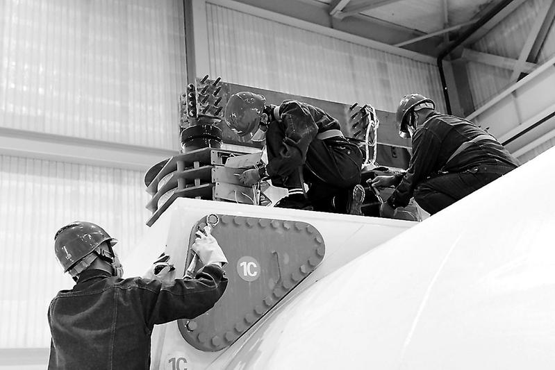近日,晉江氣電公司1號機組大修工作全面展開,本次檢修計劃工期為70天,包括燃氣輪機轉子改造、燃氣輪機燃燒器DLN2.6+升級改造、燃氣輪機和蒸汽輪機MarkⅥe控制系統升級等重要技術升級改造項目,將進一步提升機組整體熱效率及設備運行安全可靠性。圖為該公司檢修人員正在進行維修。(王素環 攝)