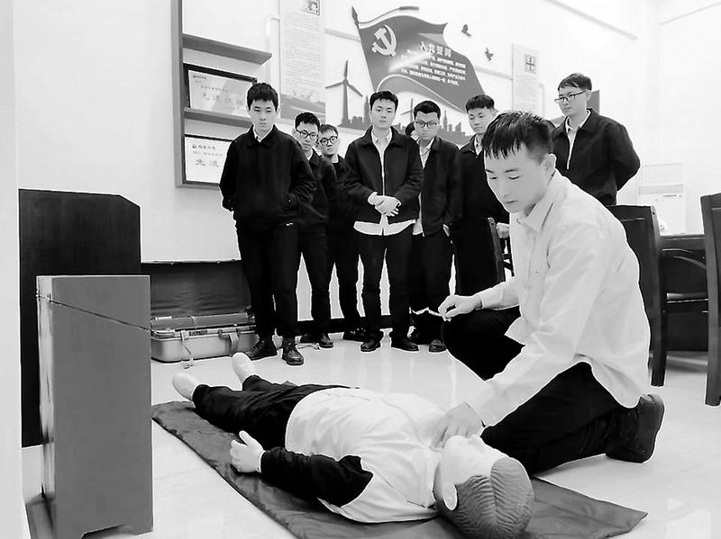 11月9日上午,福能新能源公司維檢中心利用班組安全活動日組織今年新進項目的檢修員學習消防安全知識。圖為該公司兼職消防隊員唐福全向員工演示心肺復蘇操作流程及要領。(王俊清 攝)