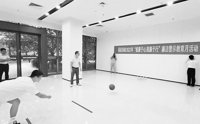 “以公謀私”“貪墨成風”“徇私舞弊”等貼有象征腐敗字樣的球瓶擋在上班的必經之路上,員工必須手持“廉潔保齡球”擊倒這些球瓶才能順利回到工位。福能海峽紀檢工作人員介紹:“這是廉潔趣味活動的隱藏游戲。”“太驚喜了,這種寓學于樂的方式很深刻!一次擊倒6個球瓶的陳偉生興奮地說。