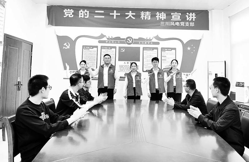 “聽黨話、跟黨走,領會精神和內涵。多學習、多宣傳,擼起袖子加油干。團結奮斗譜新篇,源源不斷發綠電。”11月18日,在三川風電公司石城升壓站黨建室,由女工和團員組成的宣講小分隊,與一線員工面對面宣講黨的二十大精神。(吳敏 攝)