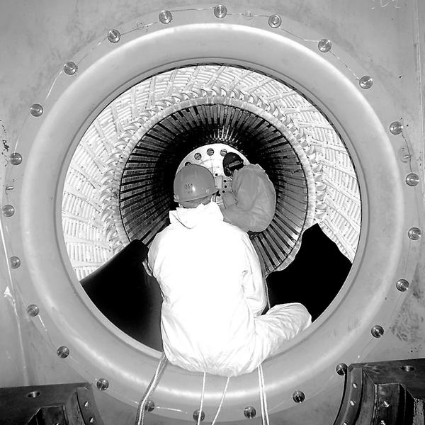 近日,晉江氣電公司1號機組大修如火如荼展開,發電機轉子繞組端部絕緣塊檢查、定子鐵芯端部模態試驗、鐵芯磁化試驗等近十項重點試驗項目正有序進行。圖為該公司檢修人員對發電機內部進行檢查處理。