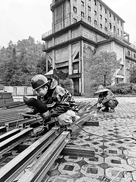 為保障井下掘進一線職工有充足的鋼棚可供使用,11月24日,永安煤業公司水井坑煤礦機運隊加班加點,在雨中加緊趕制礦工鋼棚。(鄒超男 攝)