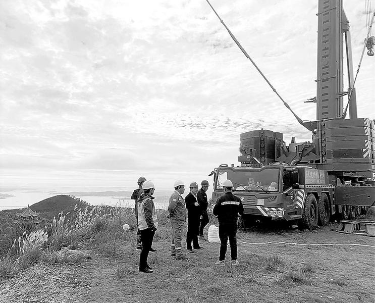 12月3日,時值周末雙休日,福能新能源公司生產部、工程項目部等人員趕赴坪洋風電場現場,充分利用小風窗口期,組織維檢人員及設備吊裝廠家人員做好風機設備吊裝,保障盛風期風機設備發電。圖為工作人員在現場進行督導協調。(林強 攝)
