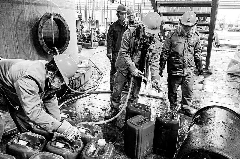 日前,福海創(chuàng)公司PTA氧化裝置催化劑罐V102-2玻璃鋼罐體底部出現(xiàn)滲漏情況。該公司生產(chǎn)第一黨支部黨員突擊隊(duì)立即趕往現(xiàn)場(chǎng),采用手動(dòng)完成催化劑倒空處理方案,完成3.8噸催化劑回收,減少了催化劑損失。(余火旺 攝)
