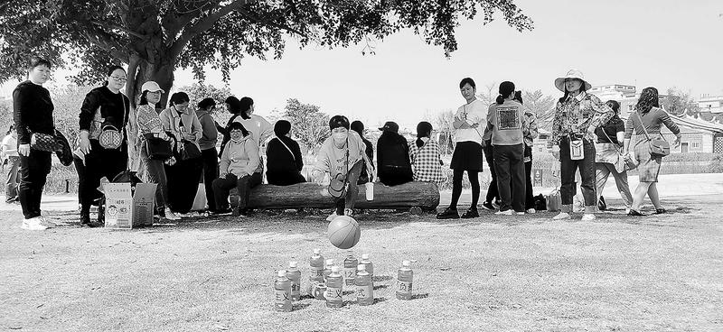 3月7日,石獅熱電公司工會組織女職工到晉江梧林傳統村落領略閩南風情,同時開展套牢“初心”、擊倒“四風”等趣味活動和家風家教分享會。圖為女職工參與擊倒“四風”項目。(蘇永洪 鄭志煒 攝)