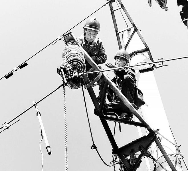 (張萍 楊斌 攝影報道) 圖為陳志暉和謝建玲在桿上作業。