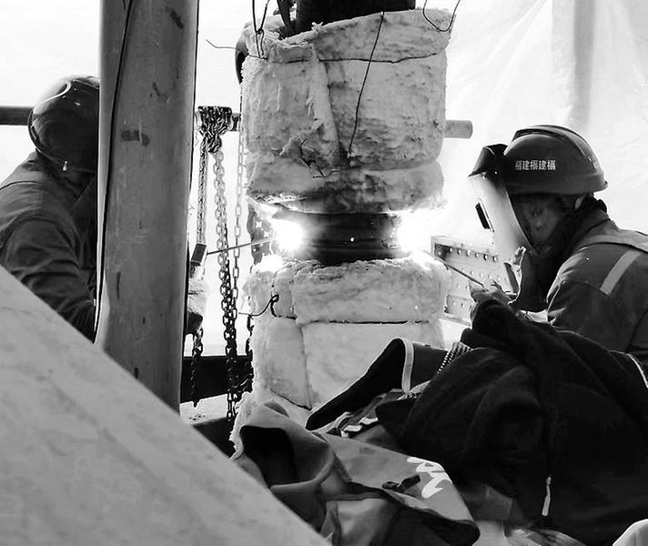 圖為技改人員正在焊接5號鍋爐屏過連通管。