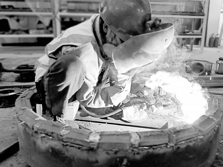 近日,新材公司權屬漳州公司為增加生產線圓錐破碎機散料盤的耐磨性,經過與廠家充分探討后,將散料盤加焊鋼軌。該舉措不僅延長了散料盤使用壽命,也減少工作人員的日常維護量。圖為工作人員正在加焊鋼軌。(王志山 攝)