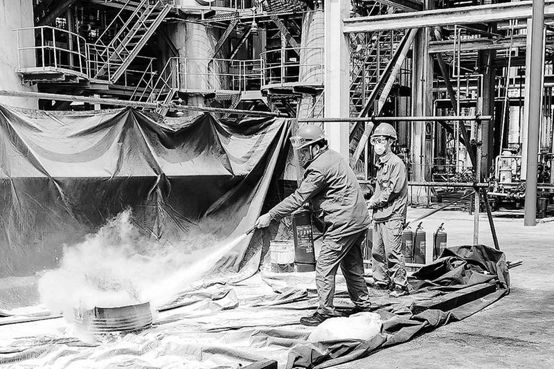 近日,福海創公司生產一團隊組織開展滅火器使用培訓活動。圖為該公司員工根據干粉滅火器的使用步驟,輪流進行滅火器實操演練。(傅志勤攝)
