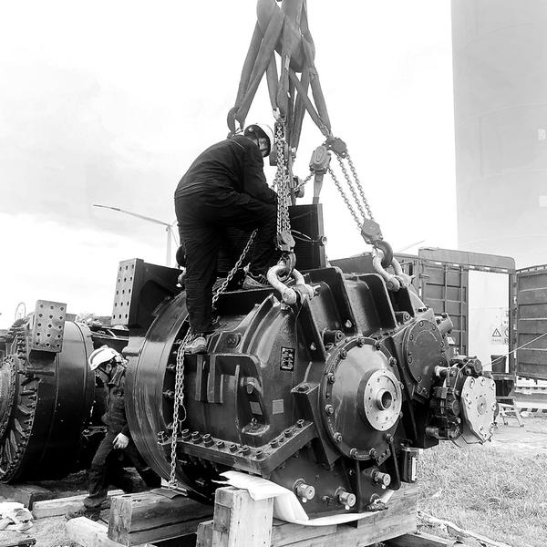 3月31日,福能新能源公司維檢中心利用短暫天晴小風窗口期,及時組織檢修人員對頂巖山風電場#12風機齒輪箱進行更換,避免齒輪箱“帶病”限功率運行,提高風機年可利用小時數。圖為600噸吊車起吊舊齒輪箱轉桿出艙現場。