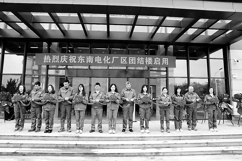 東南電化公司團(tuán)結(jié)樓(分析生產(chǎn)樓)歷經(jīng)數(shù)月熱火朝天的建設(shè)施工,終于竣工落成。3月30日上午,該公司隆重舉行團(tuán)結(jié)樓正式啟用剪彩儀式,公司在家領(lǐng)導(dǎo)班子參加了儀式。(林萌 攝)