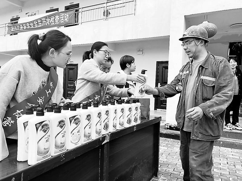 近日,邵武煤業(yè)公司組織女工家屬協(xié)管員到浦城礦業(yè)開展關(guān)懷慰問系列活動(dòng)。女工家屬協(xié)管員將慰問品發(fā)放到職工手中,并把安全祝福和叮囑送給現(xiàn)場(chǎng)的每一位職工。(趙芯 攝)