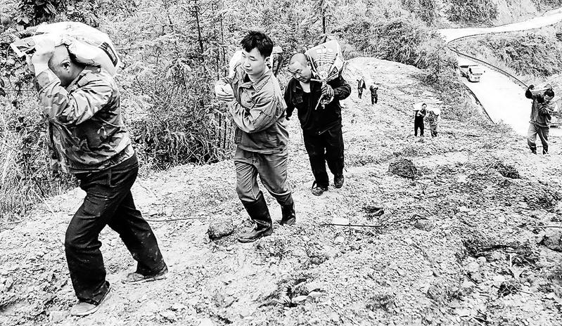 要將3噸多約160袋沙袋搬到山上,這可不是一般的體力活,再困難也決不退縮,大家擼起袖子加油干吧。黨員楊斌和黃達盛率先垂范,用繩子將塑料膜捆扎結(jié)實,兩人抬起就往山上走去。其他十余名維修人員也迅速投入搶修工作,一路上扛著沙袋艱難地行走在泥濘的山路上。