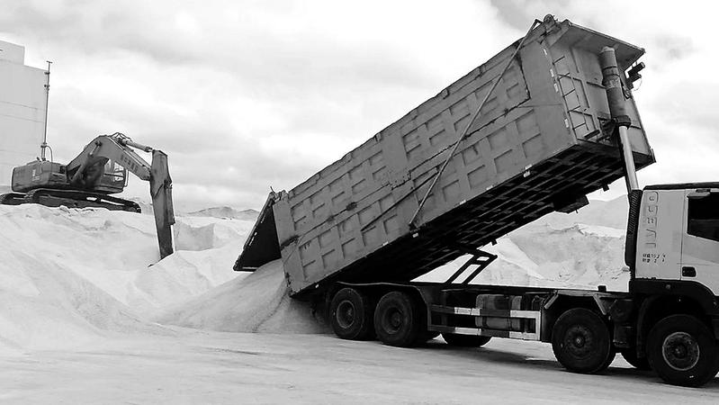 5月29日7點48分,一車來自船名 為“東京之鷹/TOKYOEAGLE”的自提外貿(mào) 鹽在東南電化公司鹽場緩緩卸下,這是公司 采取外貿(mào)鹽“船舷—廠內(nèi)堆存”模式試運行的 第一車鹽,本次直提總量達到3442噸。本次 直提成功,標志著該公司正式打通了“船邊直 提”模式。圖為直提車輛在廠區(qū)鹽場卸貨。 (黃之櫻 攝)
