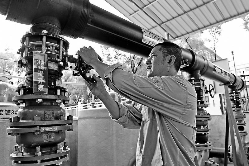 6月8日,福維公司投入165萬元建設(shè)的酸性污水 管道及提升泵站建設(shè)項目正式投入運行。該項目采用密封 管道進行明管敷設(shè),系統(tǒng)前端設(shè)置截污措施,提升輸水系統(tǒng) 可根據(jù)實際排水量進行變頻運行,確保了項目安全性和經(jīng) 濟性。圖為運行人員正在現(xiàn)場操作。(陳福華 攝)