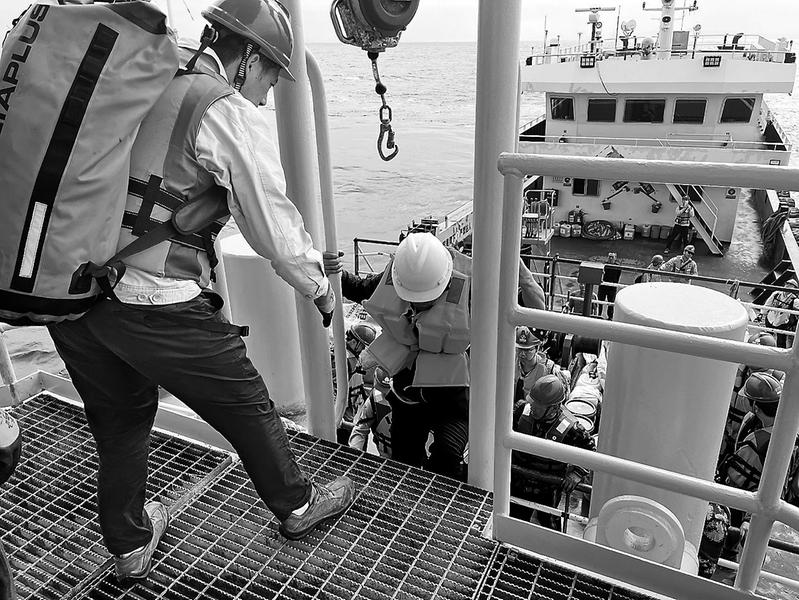 圖為維檢人員背著笨重的行囊,堅(jiān)守在海上完成消缺。