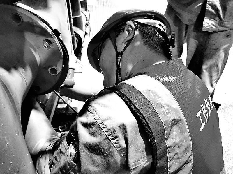 7月5日,晉南熱電公司設備部汽機專業(yè)檢修人員冒著30多攝氏度的高溫,連續(xù)苦戰(zhàn)兩個小時,為化水系統(tǒng)的2號RO產水管道更換防爆膜。(周國利 攝)
